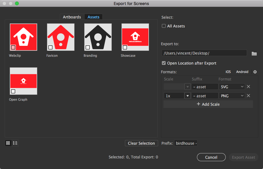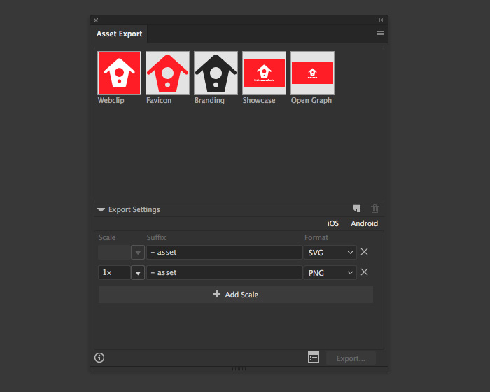 Export using cmd+alt+E (or ctrl+alt+E on Windows) to export all Artboards at once. You can export in PNG and SVG at the same time. However don't use SVG versions for Favicon and Webclip.